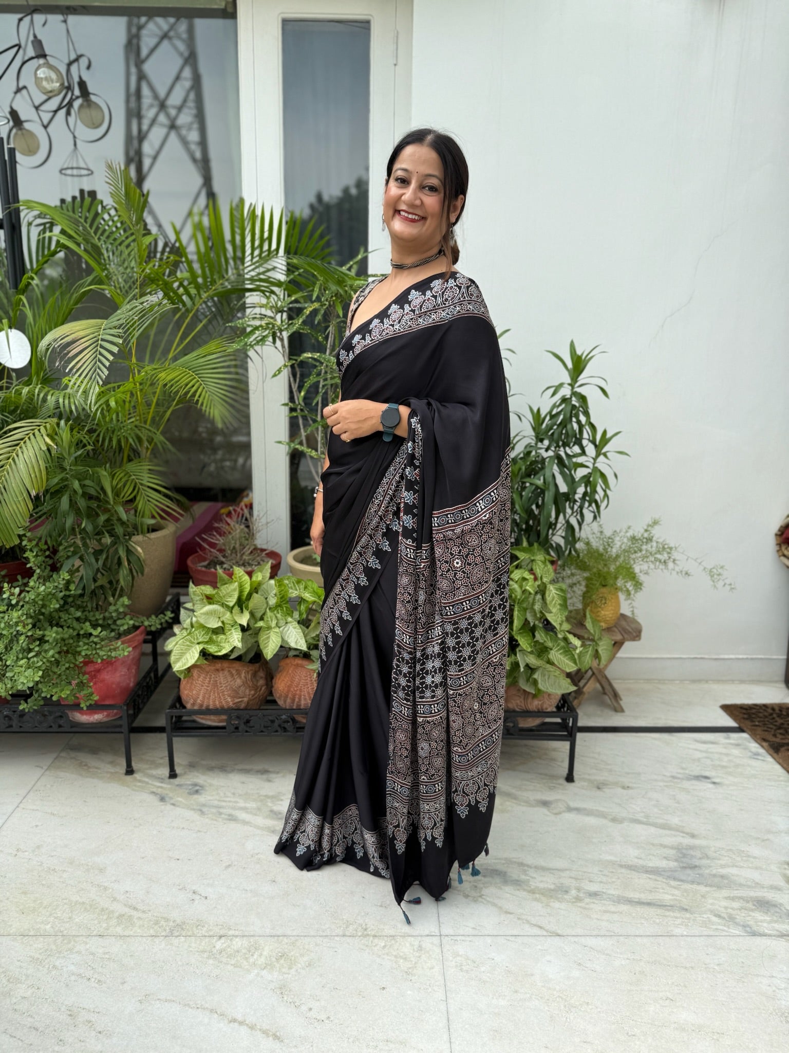 Beige and Black Hand Block Cotton Silk Maheshwari Saree