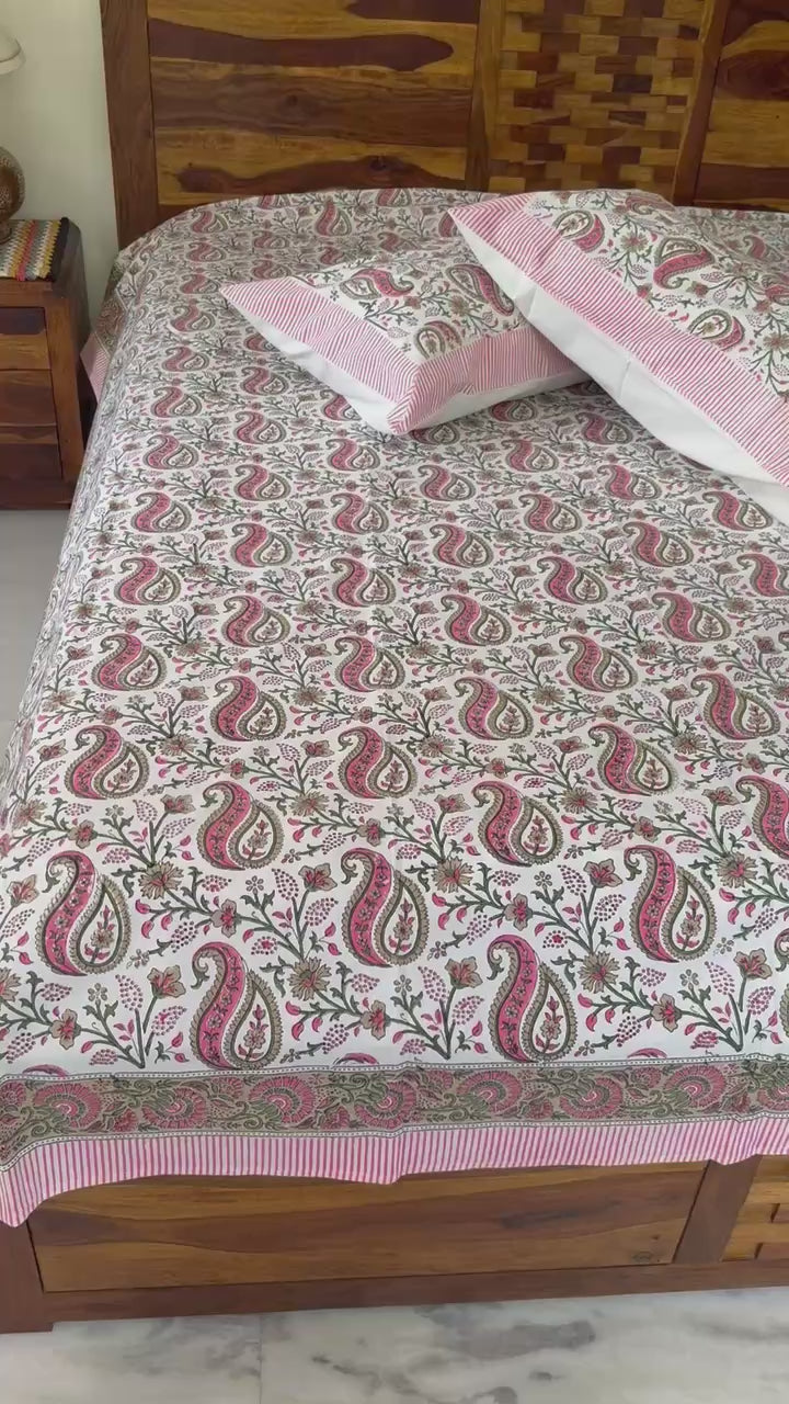 Hand Block Printed Ivory Paisley Cotton Bedsheet with Pink & Green Motifs (with Pillow Covers)